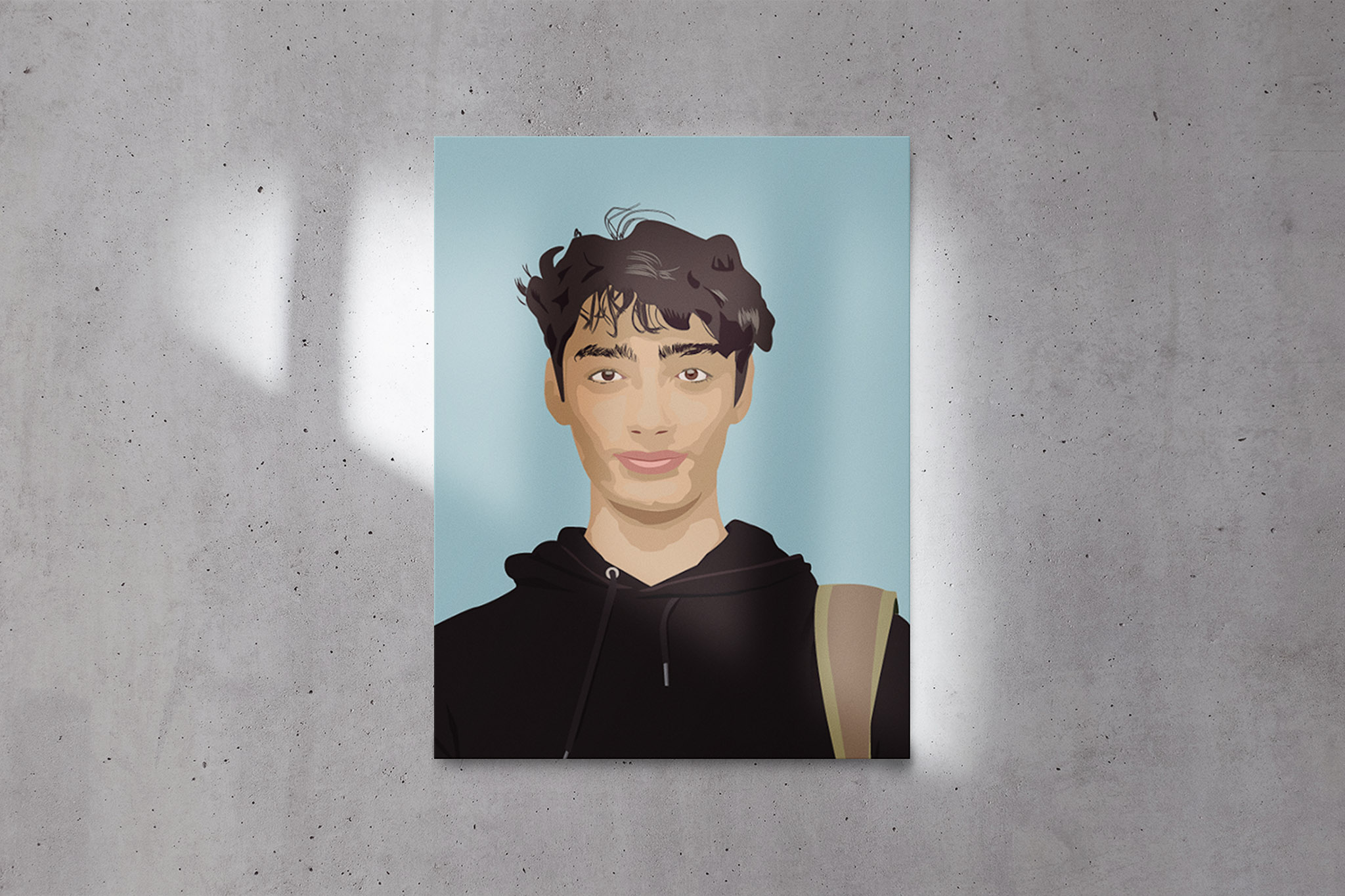 A vector based self-portrait. I never did a self-portrait before using Illustrator, so I think this turned out really well. I kind of just figured it out as I went, starting at the neck and face, before moving onto the hair and finally the hoodie and backpack strap. I did everything in grey before adding colour.
