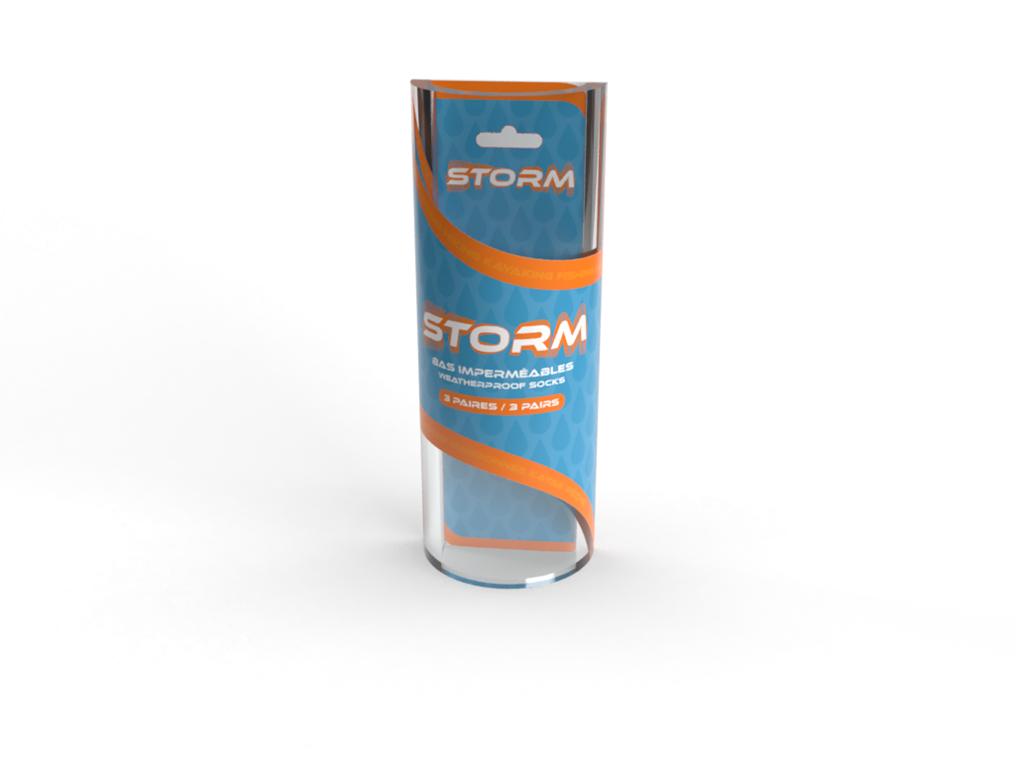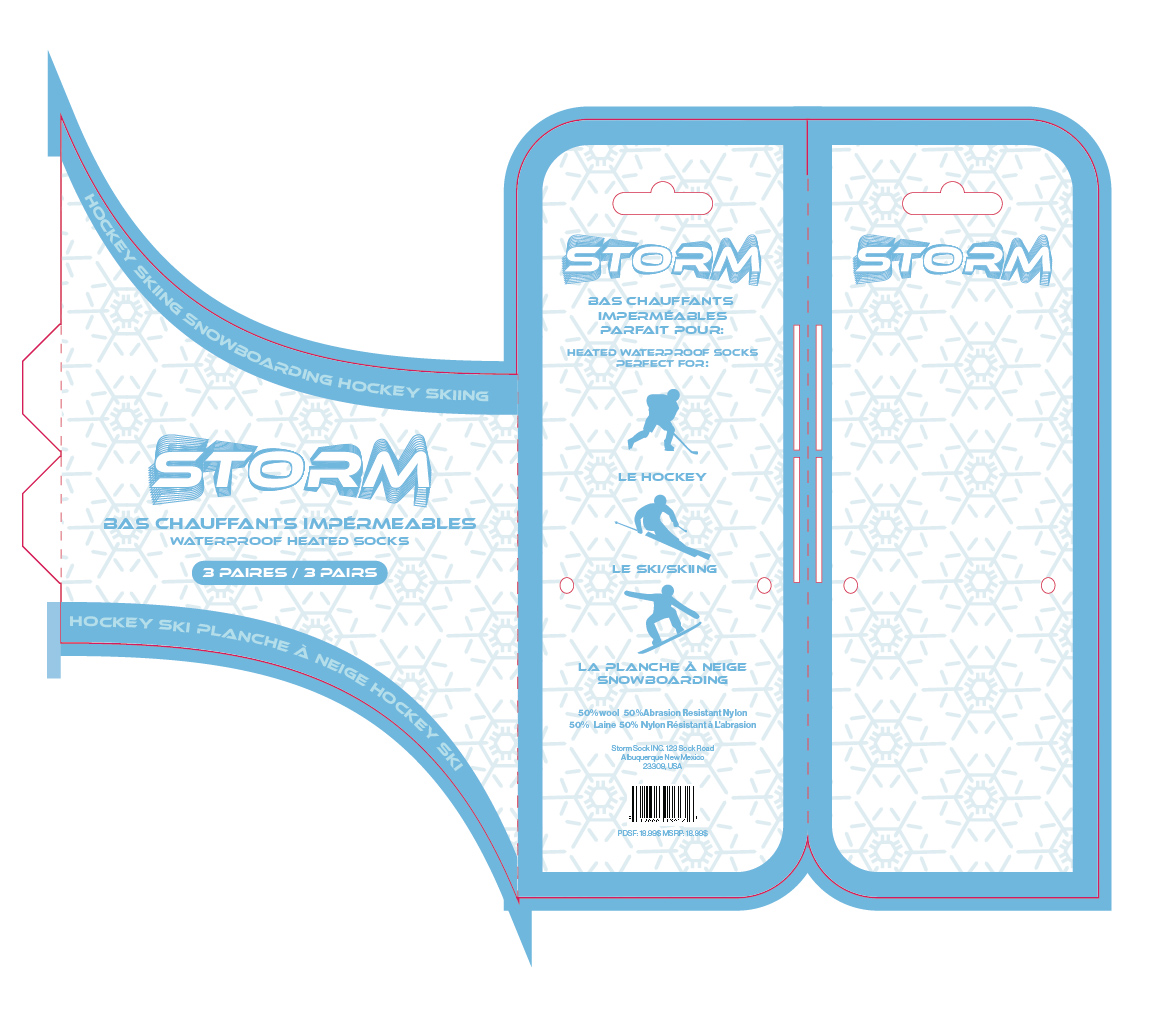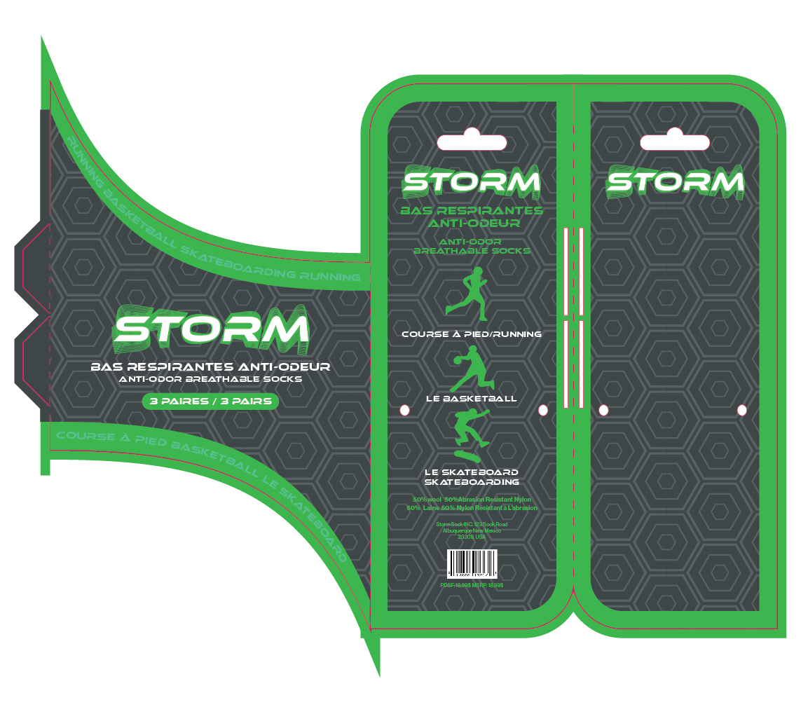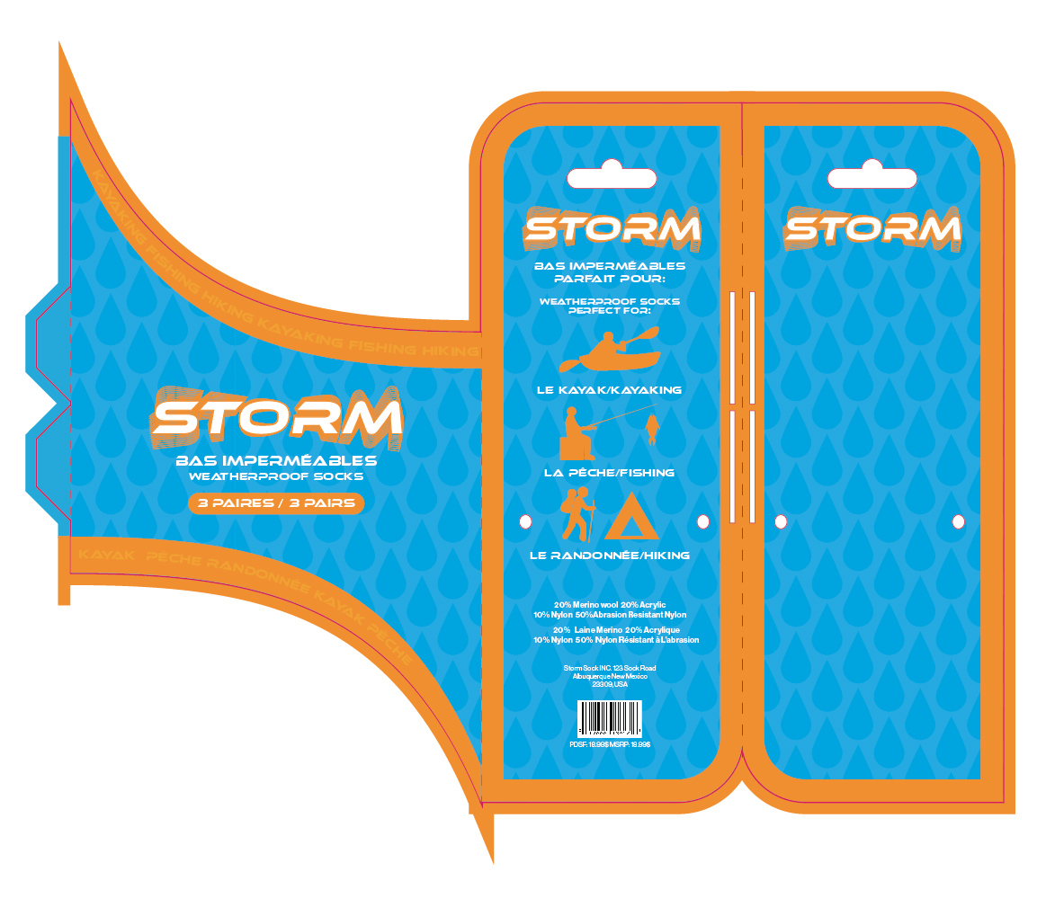 Packaging and custom dieline design for athletic socks. I chose the name Storm because these socks are meant for you to wear when facing the elements, particularly for the waterproof and heated socks. The waterproof socks use a mainly blue design with a subtle water drop pattern and vibrant orange to evoke energy and sport. The heated socks use icy blue and white packaging with a snowflake pattern, while the anti-odor socks use a fresh green, which pops on the ashphalt grey background.