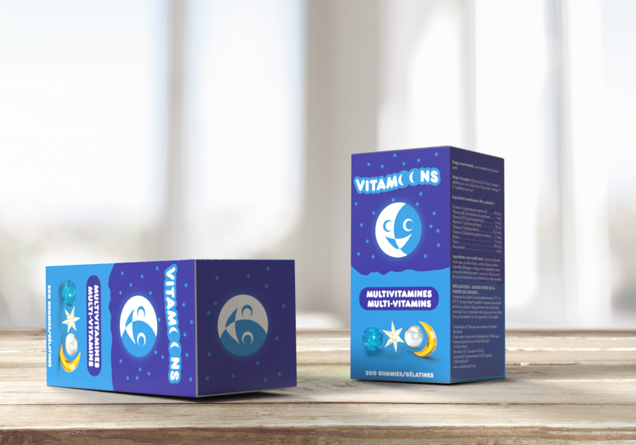 Here I had to create the packaging and branding for a children’s vitamin brand. To appeal to kids, I created a playful name, Vitamoons, and a smiling moon logo. The gummies I then modelled after playful shapes of stars and moons too.