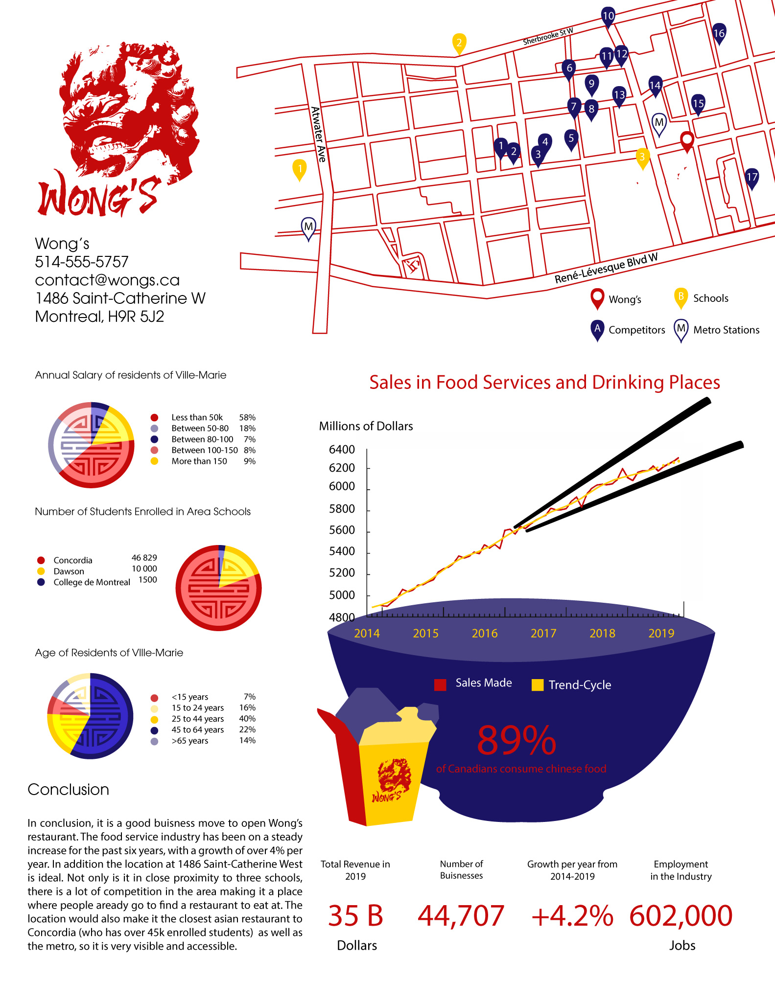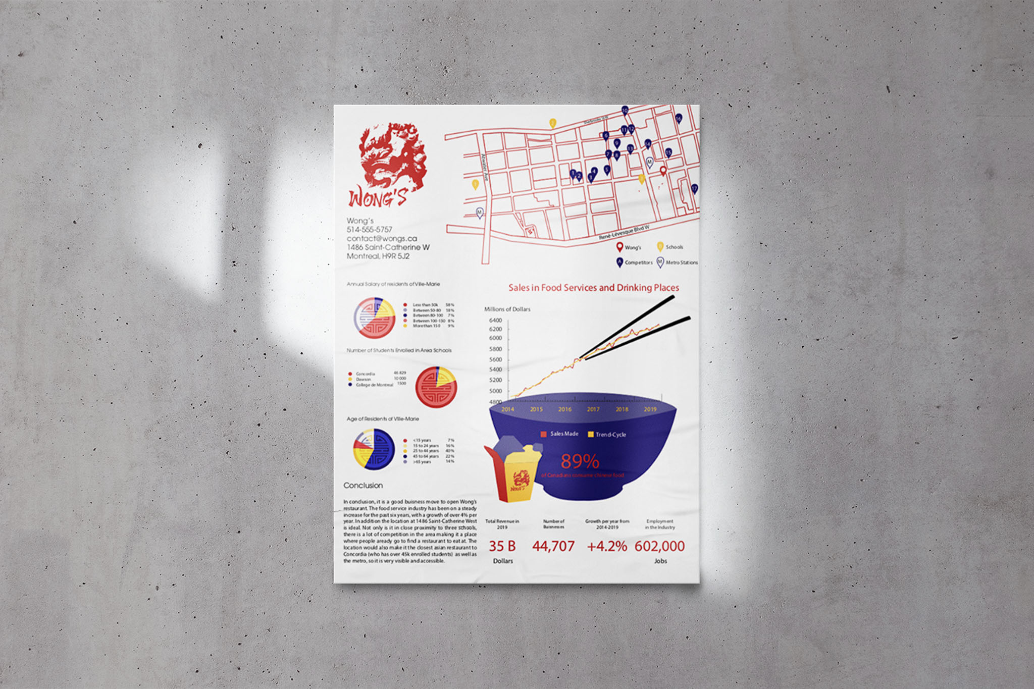 Infographic and rationale as to why opening a Wong’s restaurant would be a good idea. I thought the undulating lines on the graph kind of looked liked ramen, so I added the chopsticks and bowl to spice up the infographic. The pie graphs are or detailed with the shou symbol.