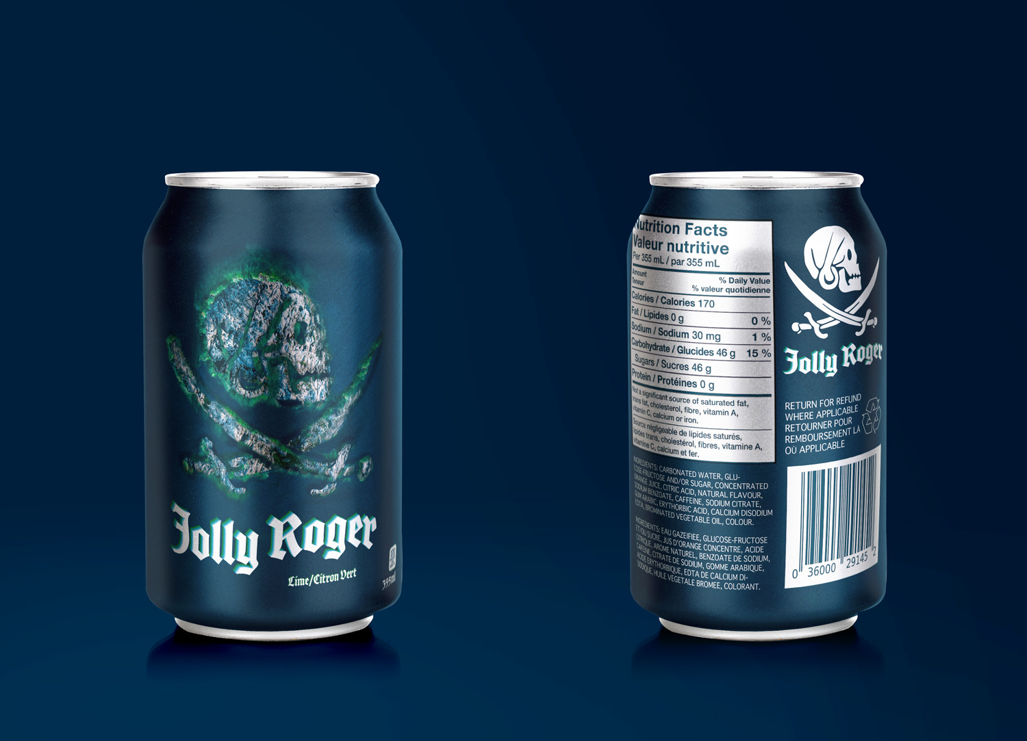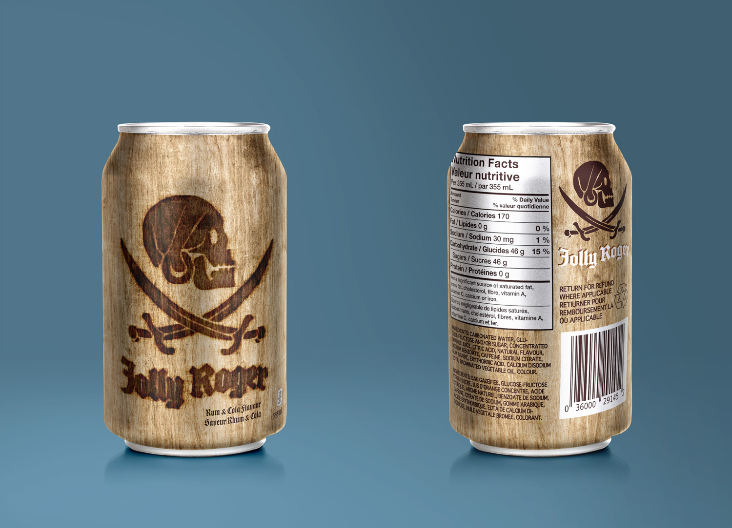 The second Jolly Roger soda can is made to look like a wood burn engraving, like an old barrel. This is to represent the flavor of rum and cola, since rum was kept in barrels by pirates.