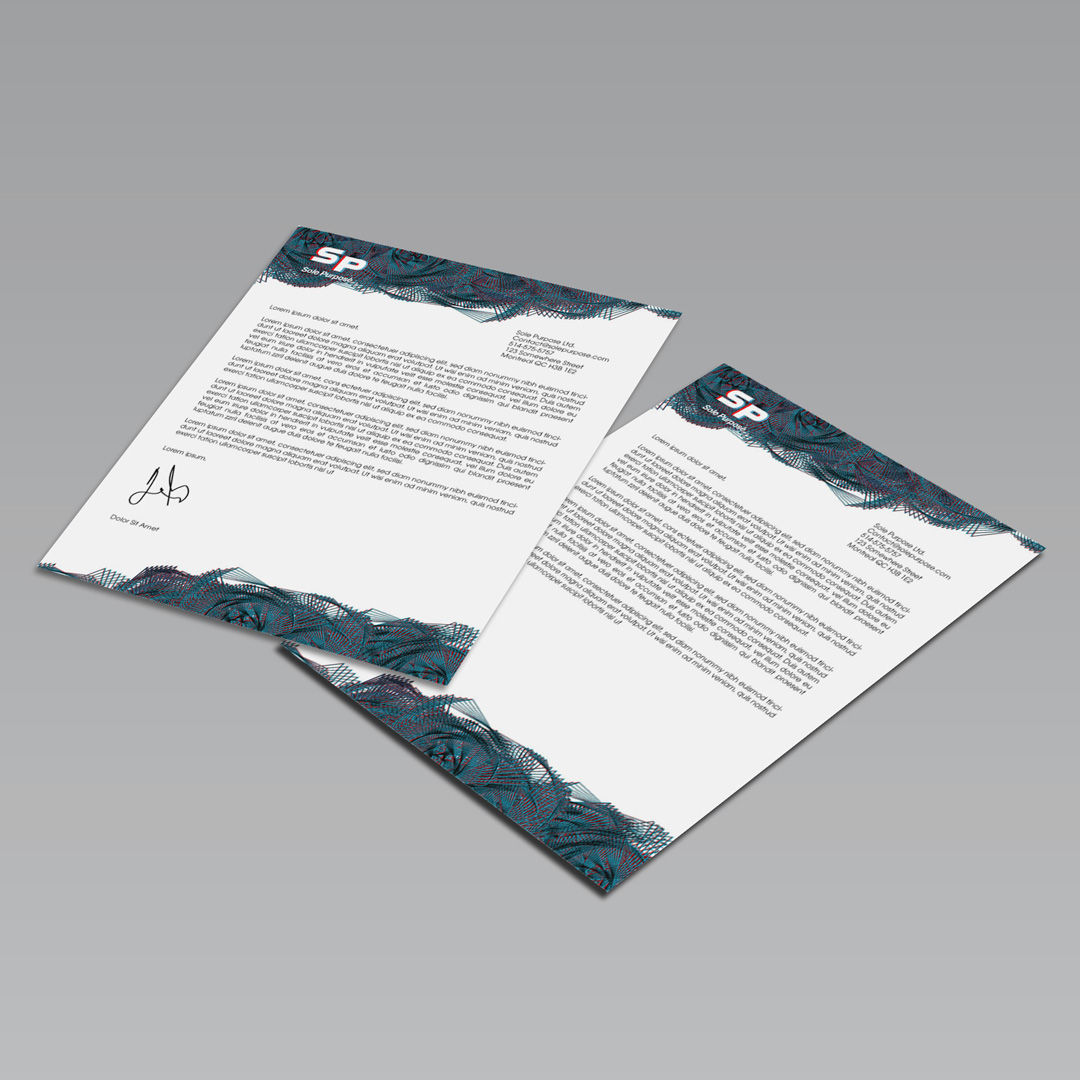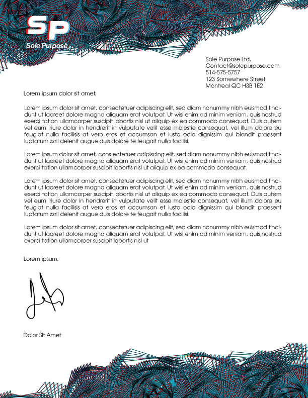 A simple Letterhead design. Complex asymmetrical geometric patterns border the top and bottom of the otherwise simple letter to create contrast and add some flair.