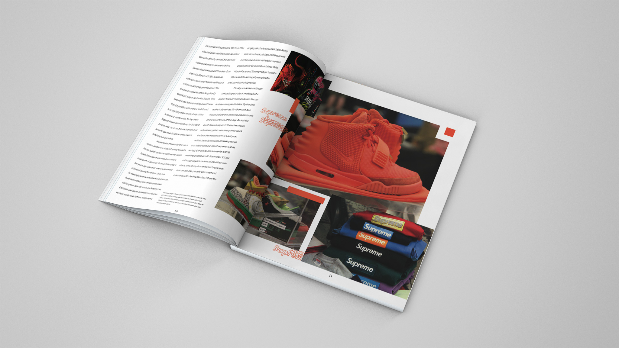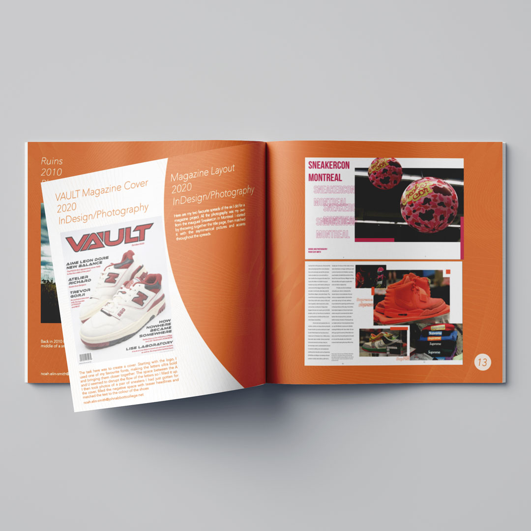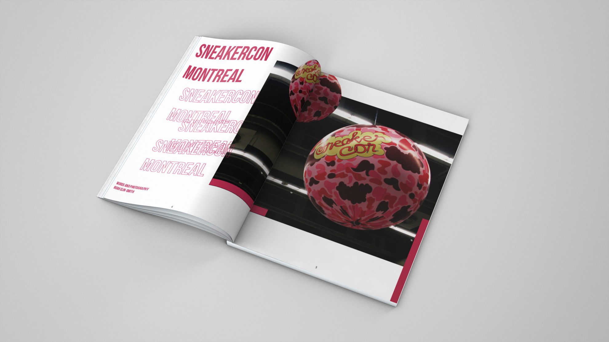 Here are my two favourite spreads of the six I did for a magazine layout project. All the photography was my own from the inaugural Sneakercon in Montreal. I started by throwing together the title page, matching the asymmetrical pictures and accents throughout the spreads.