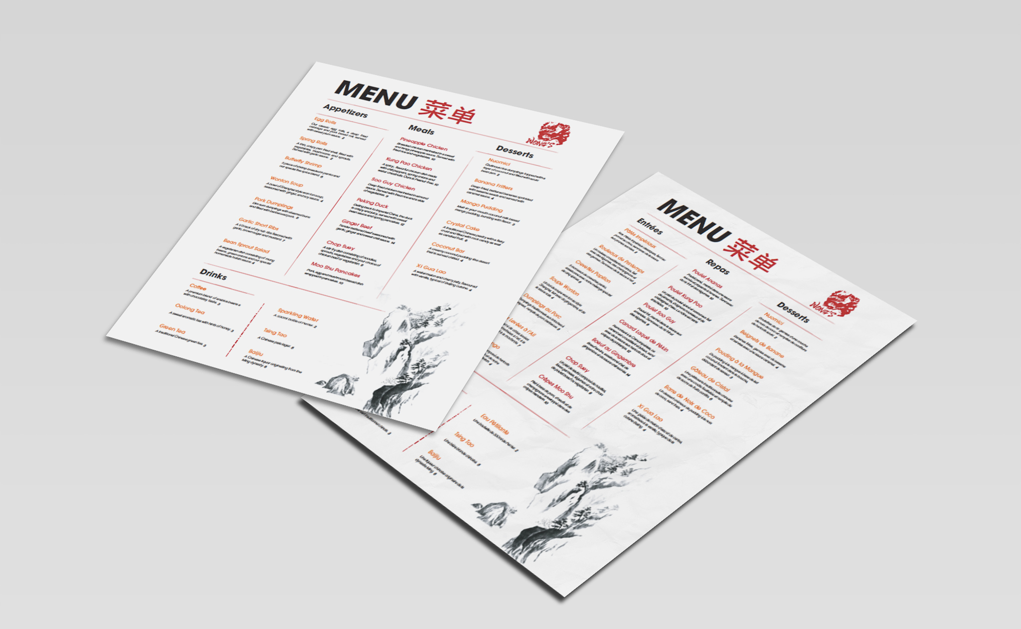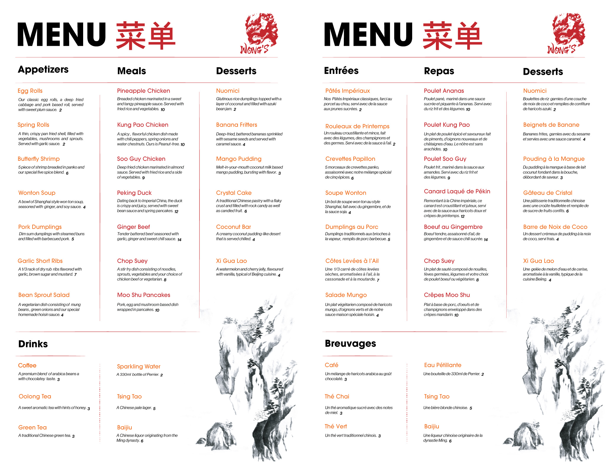 A bilingual menu for a concept Chinese restaurant, Wong’s. I kept it modern and minimalist but added a royalty free, Chinese, ink landscape to keep match the logo and maintain the theme.