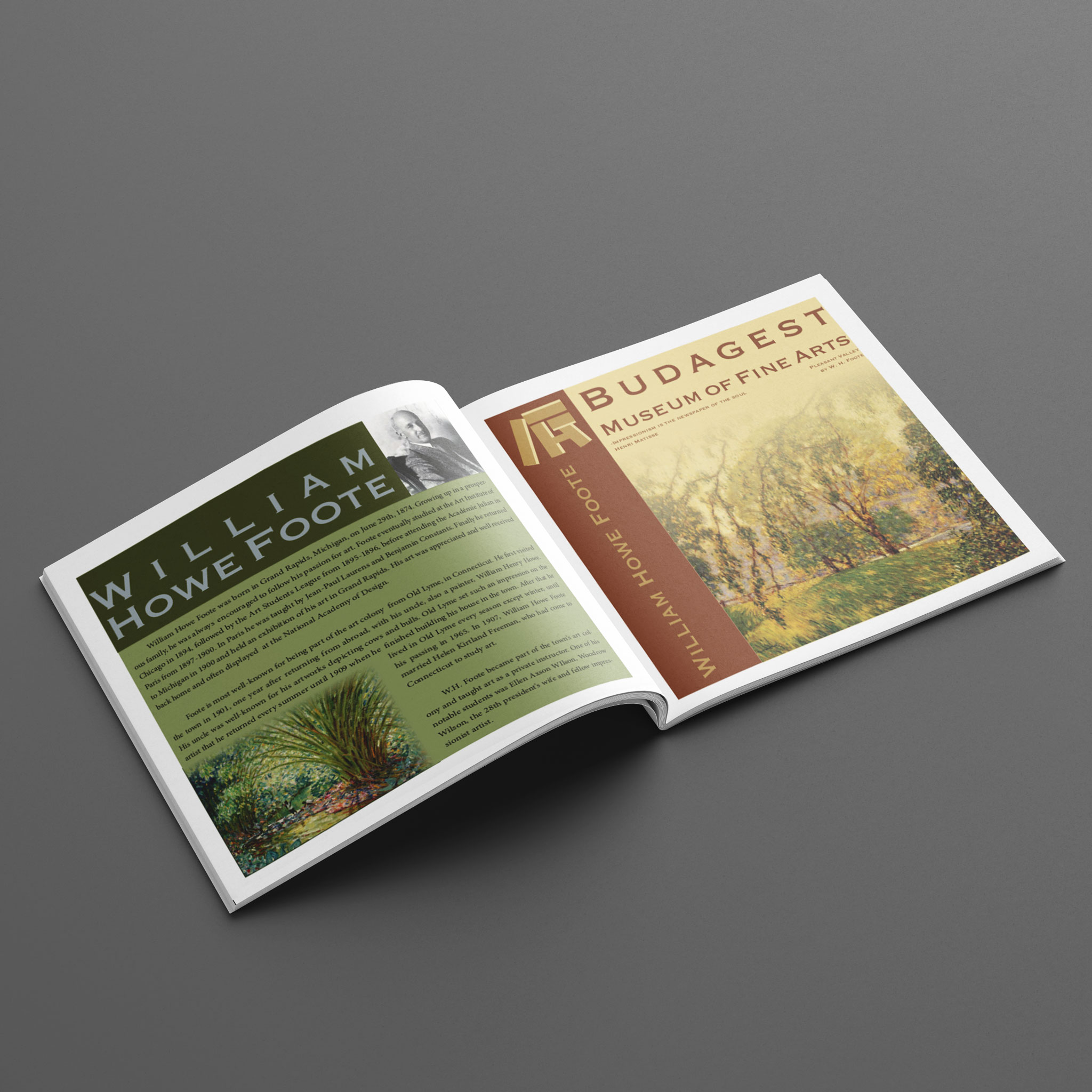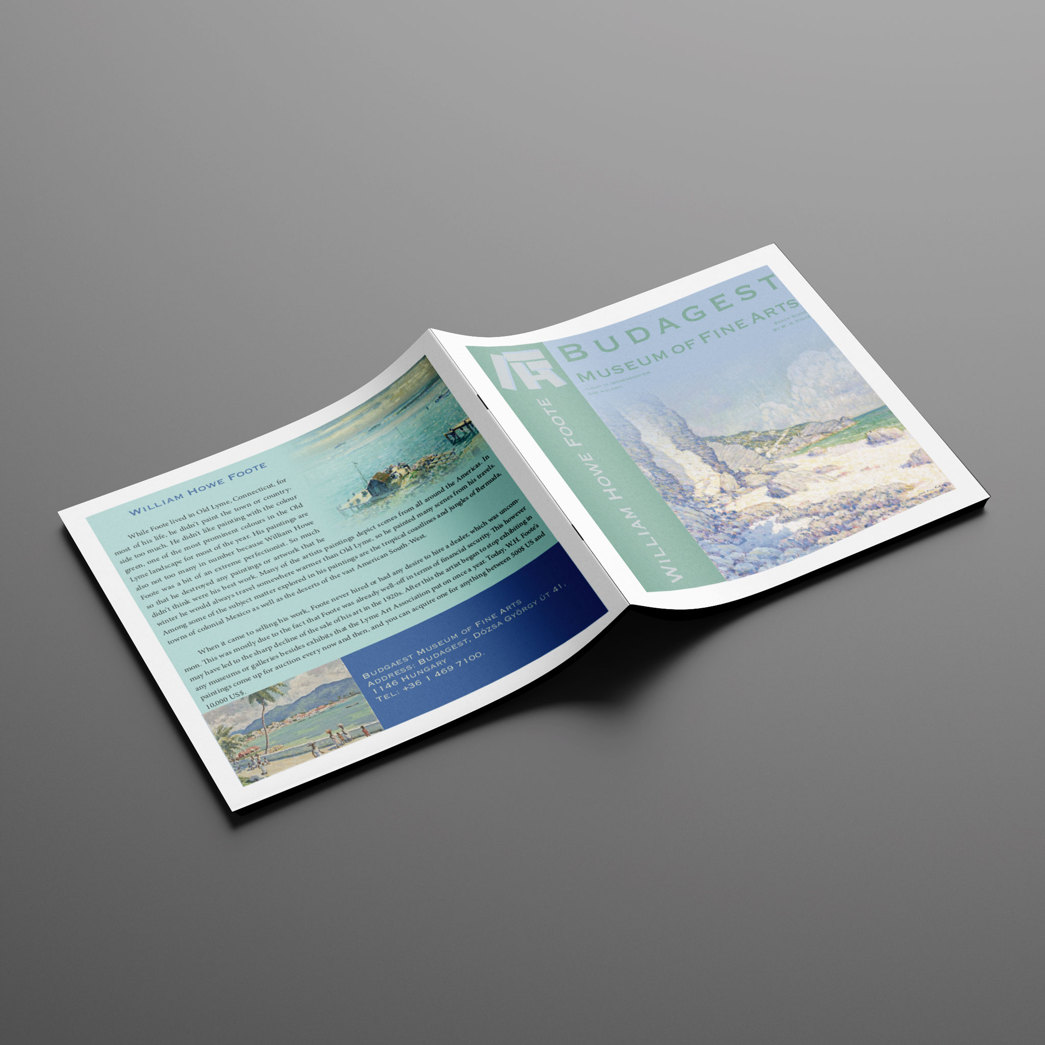 Tasked to design a pamphlet to promote an exhibit at a fictional Museum of Fine Arts. Budagest is not a typo, but a conscious decision to not infringe on copyrights. I chose some of my favorite artworks from the artist William Howe Foot, then drew the colors for the booklet based off those paintings.