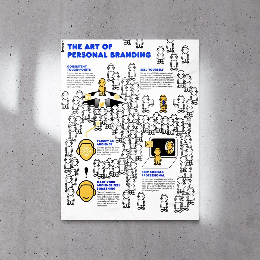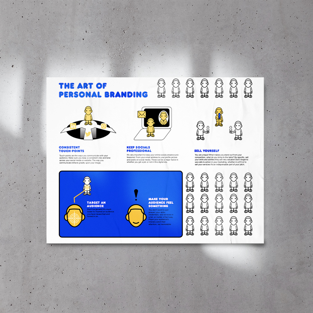 An infographic about personal branding. I created two versions, one more chaotic and one simple and clean. I think the assymetrical one works better,as it's more interesting, unique, although both are clean.