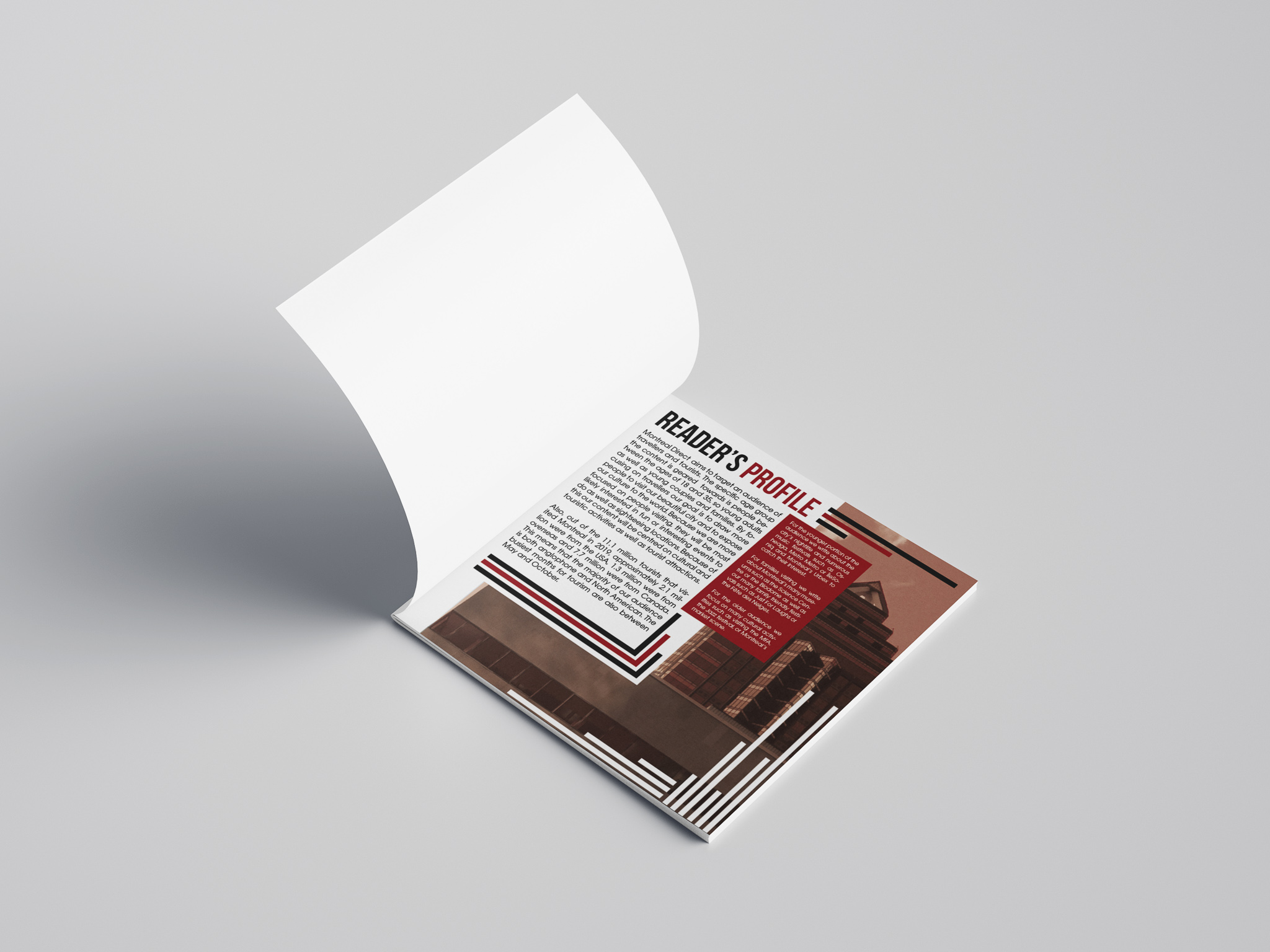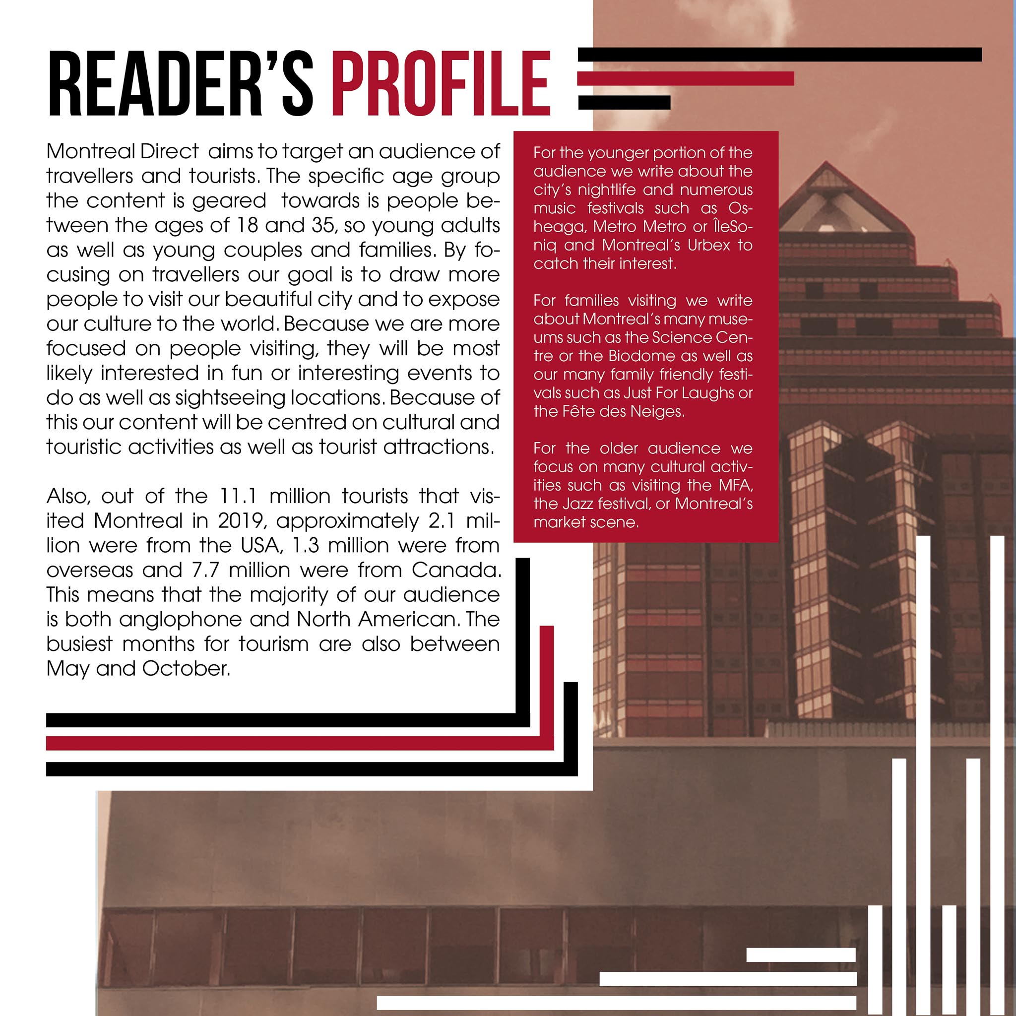 A quick page layout for a reader’s profile, that I think turned out really well. The magazine was about Montreal, so I started by adding the picture I took of one an iconic Montreal high rise. I then put in the text and added the bars, which mimic the lines on the building. They also serve to lead your eye around the page